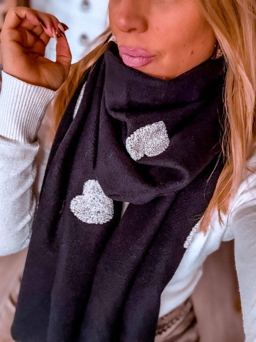 écharpe cœur, écharpe doudou, écharpe hiver femme, écharpe douce, écharpe rose, écharpe noire, écharpe girly, idée cadeau femme, écharpe chaude femme.