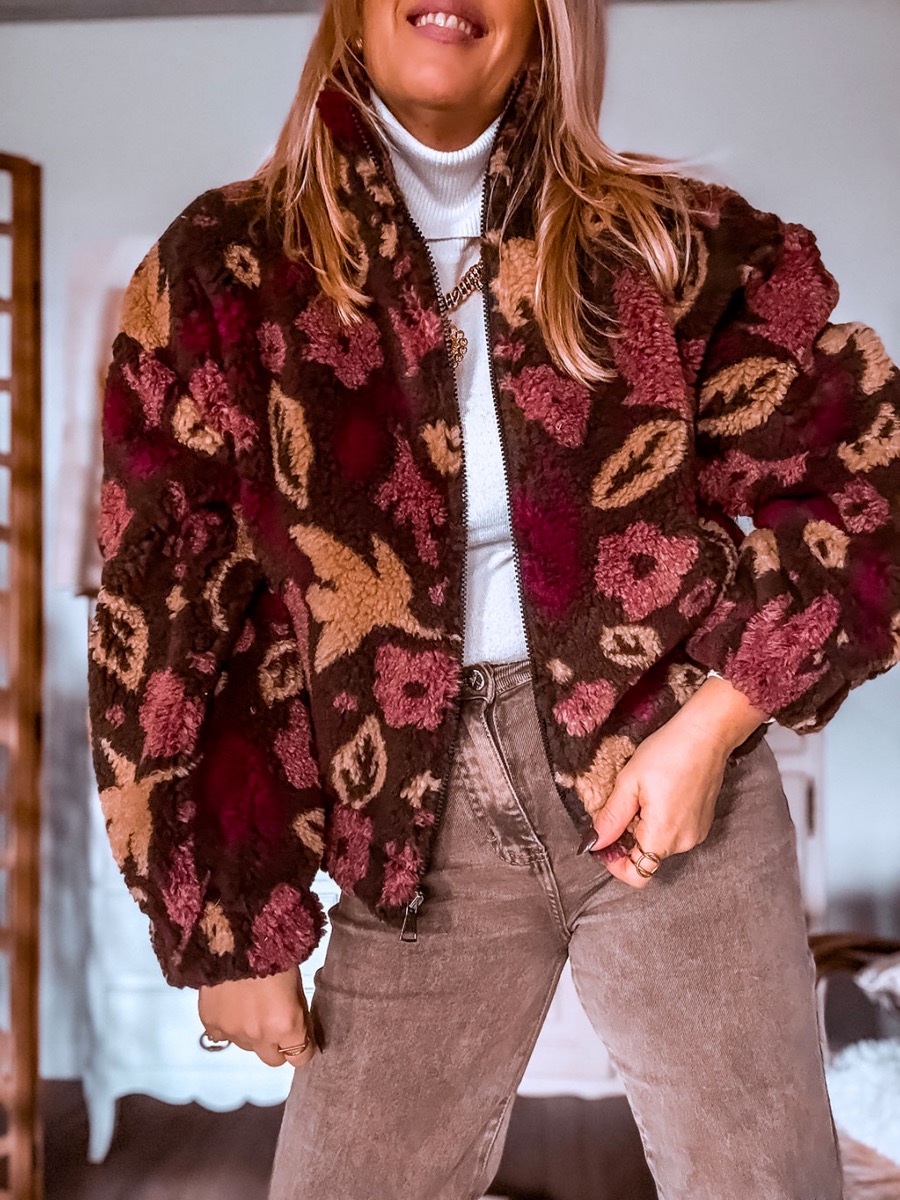 veste teddy femme, veste oversize hiver, manteau sherpa, veste fleurie bordeaux, veste chaude automne, teddy imprimé, manteau bohème chic, boutique femme tendance, look cosy hiver