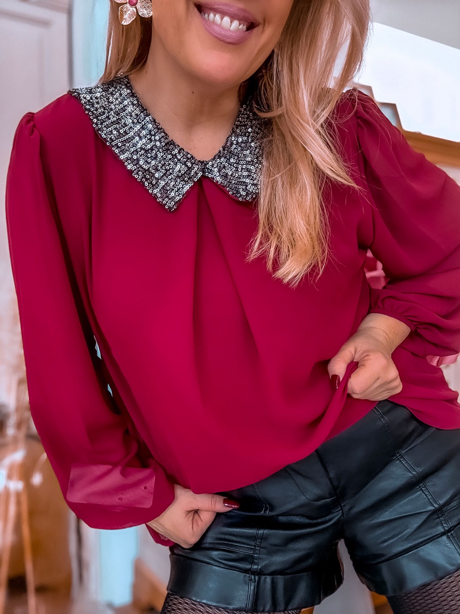 blouse col bijoux femme, blouse sequins, blouse chic femme, blouse soirée, blouse bordeaux femme, blouse noire élégante, blouse chocolat, top chic Saori, blouse fluide fe
