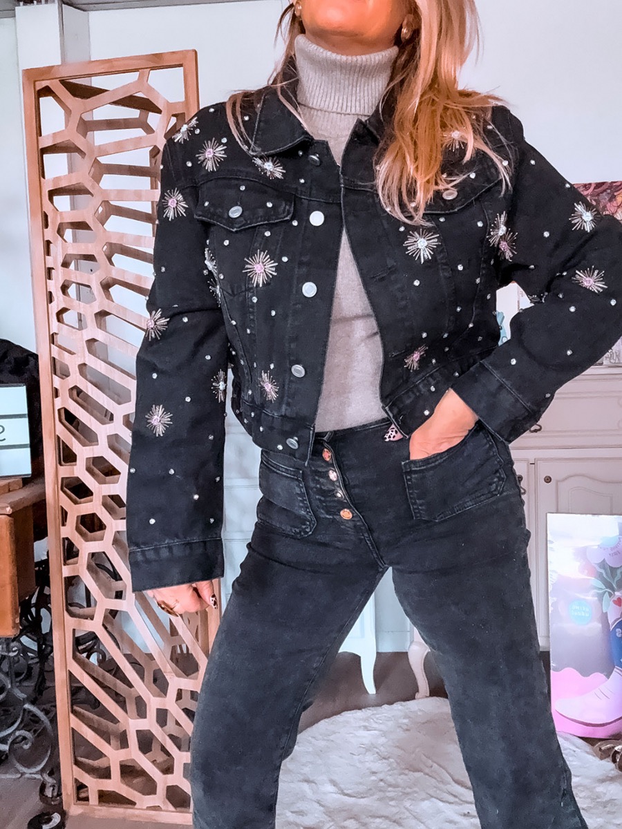 veste jean noir, veste denim noir délavé, veste strass femme, veste jean tendance, veste noire chic, veste jean glamour, veste casual chic, Saori Boutique veste
